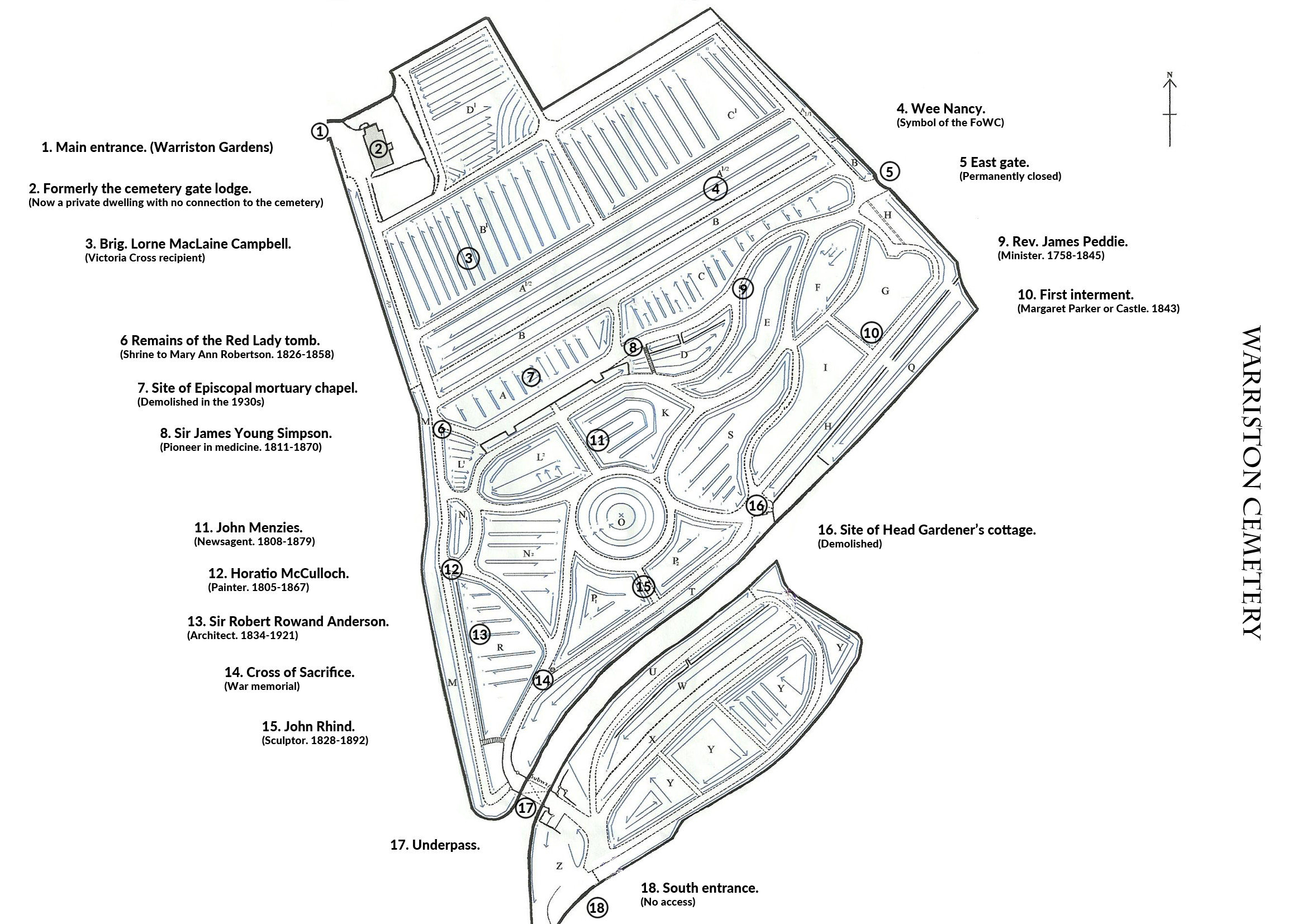 Points of interest map. 13 Monday Nov 2017 Posted by friendsofwarristoncemetery in Information ≈ Leave a comment This map indicates just some of the many points of interest within Warriston Cemetery. Click on the map to view it full-size. Opens in a new tab/page. If printing, it’s best to set it to A4 size, landscape format, no margins, no headers/footers. Share this: Click to share on X (Opens in new window) X Click to share on Facebook (Opens in new window) Facebook Click to email a link to a friend (Opens in new window) Email Like Loading... Related