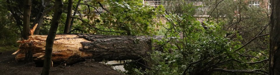 The foot of the tree was lying where it had broken off, supported by the raised ground there and by some of its still-attached branches which were in the river. The rest of the tree jutted out over the Water of Leith and the upper section was partly on the river and riverbank, partly on the raised flood protection walkway and protruded into Warriston Road.