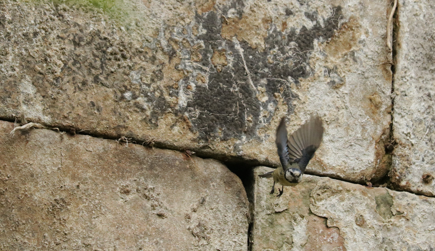 This blue tit is house-hunting already. It checked out this gap in the stonework, disappearing inside twice as I watched.